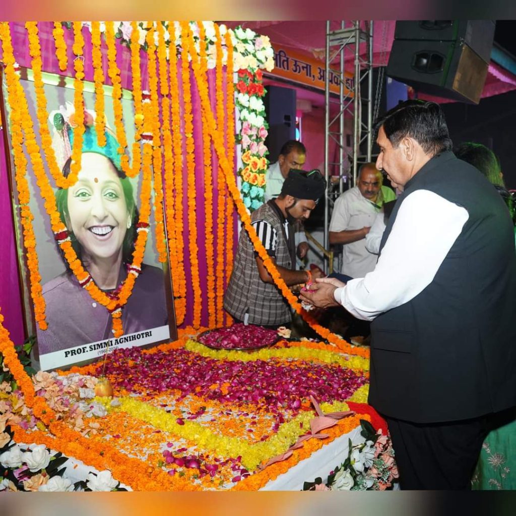 समाजसेवा और शिक्षा के क्षेत्र में उत्कृष्ट योगदान देने वाली स्वर्गीय प्रो.सिम्मी अग्निहोत्री की स्मृति में ऊना के श्री रामलीला मैदान में एक भव्य साईं संध्या का आयोजन किया गया।इस विशेष आयोजन में सूफी ब्रदर्स हमसर हयात अथर निजामी और प्रसिद्ध गायक गुरप्रती गुप्पी ने कार्यक्रम को आध्यात्मिक सुरों से सजाया,जिसने हर किसी के हृदय को छू लिया।इस अवसर पर हिमाचल प्रदेश के उपमुख्यमंत्री मुकेश अग्निहोत्री,उनकी बेटी डॉ.आस्था अग्निहोत्री,भाई डॉ.राकेश अग्निहोत्री,विधायक विवेक शर्मा और उनकी धर्मपत्नी मृदु शर्मा,विधायक सुदर्शन बबलू,कांग्रेस नेता संजीव सैणी सहित अनेक गणमान्य व्यक्ति उपस्थित रहे।