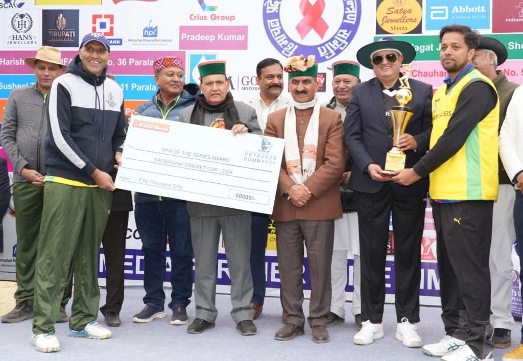 हिम स्पोर्टस एण्ड कल्चरल एसोशिएसन द्वारा बीसीएस शिमला में नशे के खिलाफ जागरूकता फैलाने के उद्देश्य से आयोजित सद्भावना क्रिकेट कप में गवर्नर-इलेवन की टीम ने जीत दर्ज की।विवेक भाटिया और आबिद हुसैन सादिक को संयुक्त रूप से मैन ऑफ द सीरीज घोषित किया गया।फाइनल मैच में गवर्नर-इलेवन टीम ने चीफ जस्टिस-इलेवन की टीम को 32 रनों से हराया।इस अवसर पर मुख्यमंत्री ठाकुर सुखविंद्र सिंह सुक्खू ने मैन ऑफ द मैच विवेक भाटिया तथा पिछले कल गवर्नर एवं प्रेस के बीच खेले गए मैच के मैन ऑफ द मैच आबिद हुसैन सादिक तथा चीफ जस्टिस-इलेवन एवं सीएम-इलेवन के बीच खेले गए मैन ऑफ द मैच विकास भारद्धाज को सम्मानित किया।मुख्यमंत्री ने सद्भावना क्रिकेट कप के माध्यम से नशे के विरूद्ध जागरूकता पैदा करने के लिए आयोजकों के प्रयासों की सराहना करते हुए कहा कि राज्य सरकार प्रतिबद्धता से नशे की बुराई पर अंकुश लगाने के लिए कार्य कर रही है। इस दिशा में खेलों को बढ़ावा देने तथा युवाओं को विभिन्न अवसर उपलब्ध करवाने की दिशा में कार्य किए जा रहे हैं।