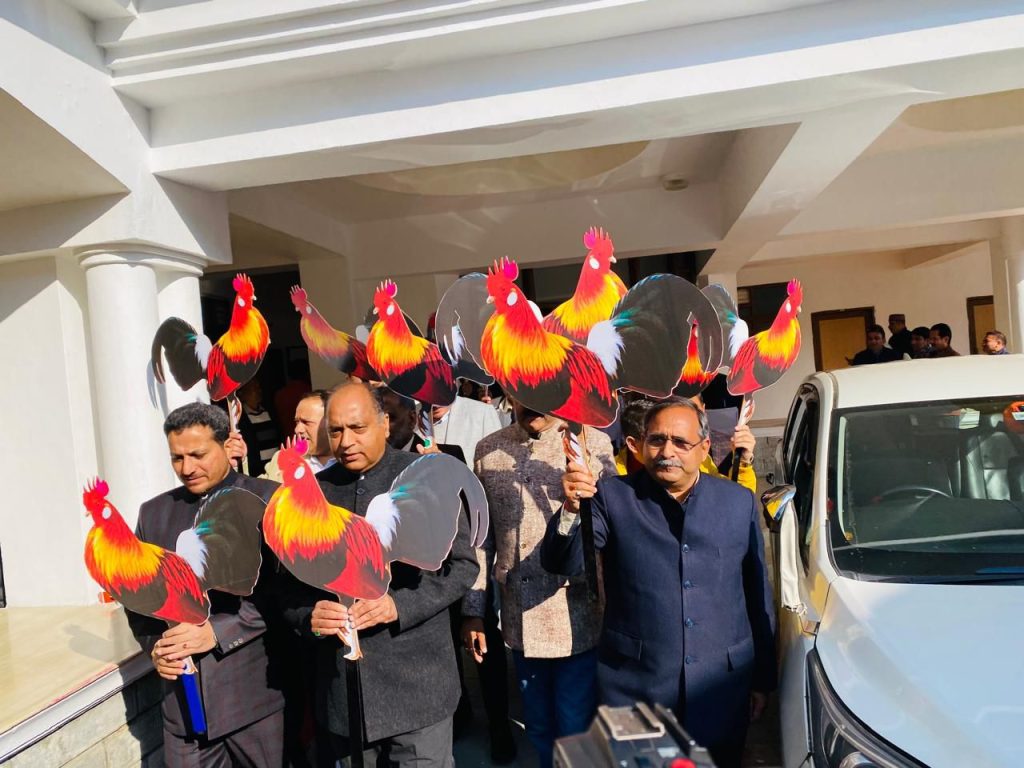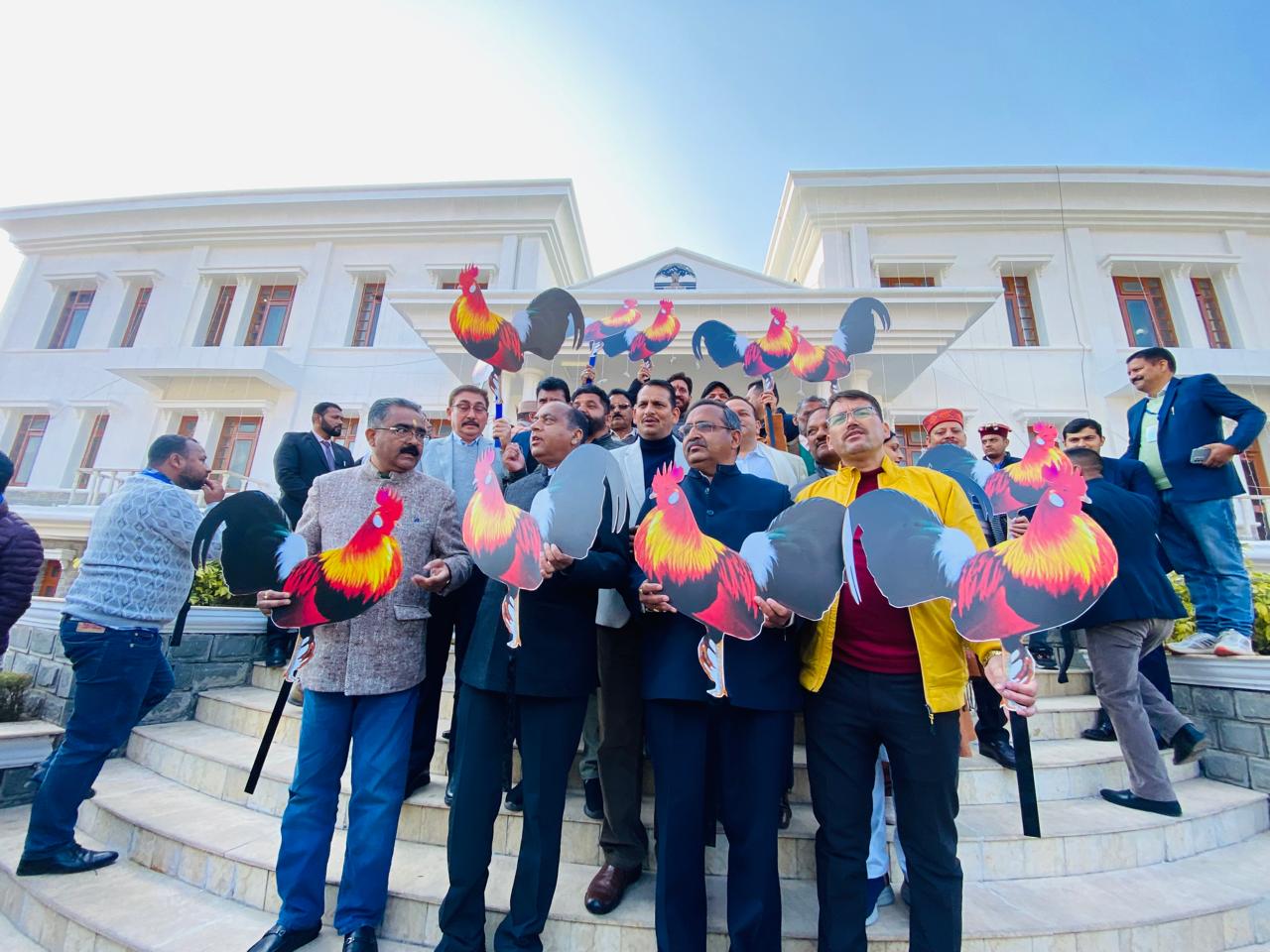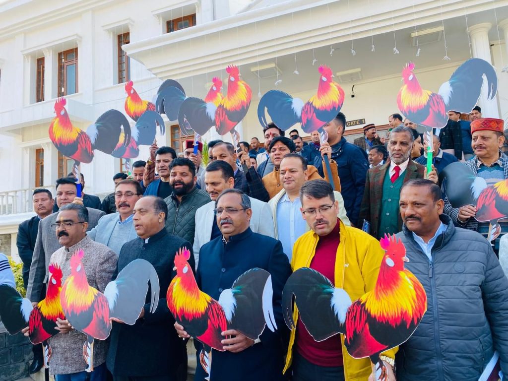 हिमाचल प्रदेश विधानसभा शीतकालीन सत्र के दूसरे दिन ‘जंगली मुर्गा प्रकरण’की गूंज विधानसभा परिसर में सुनाई दी,भाजपा विधायकों ने सदन के बाहर जंगली मुर्गा प्रकरण पर मुख्यमंत्री सुखविंदर सिंह सुक्खू को निशाने पर लिया,इस दौरान भाजपा विधायक जंगली मुर्गा कट आउट के साथ विधानसभा परिसर पहुंचे और सरकार के खिलाफ नारेबाज़ी की,इस दौरान विपक्ष ने मुख्यमंत्री को कुपवी दौरे के दौरान डिनर में कथित तौर पर जंगली मुर्गा परोसे जाने की जांच की मांग की,बीजेपी विधायक दल ने इस मामले में मीडिया और सोशल मीडिया के लोगों पर मामला दर्ज करने को दुर्भाग्यपूर्ण बताया है।