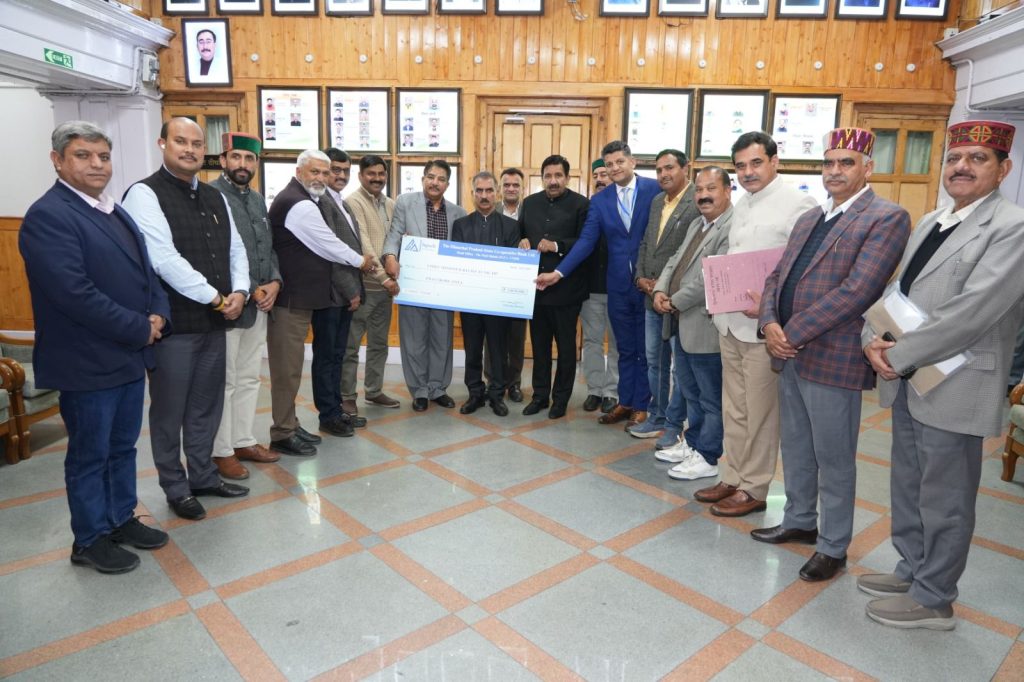 उप-मुख्यमंत्री मुकेश अग्निहोत्री ने मुख्यमंत्री ठाकुर सुखविंद्र सिंह सुक्खू को 2 करोड़ रुपये का चेक भेंट किया।यह चेक हिमाचल प्रदेश राज्य सहकारी बैंक की ओर से मुख्यमंत्री राहत कोष के लिए प्रदान किया गया।इस अवसर पर आयुष मंत्री यादविन्द्र गोमा,विधायक संजय रतन,संजय अवस्थी,नीरज नैयर,विवेक कुमार और कैप्टन रणजीत सिंह राणा,बैंक के अध्यक्ष दवेन्द्र सिंह श्याम,प्रबंध निदेशक शरवन मान्टा और बैंक के निदेशक उपस्थित थे।