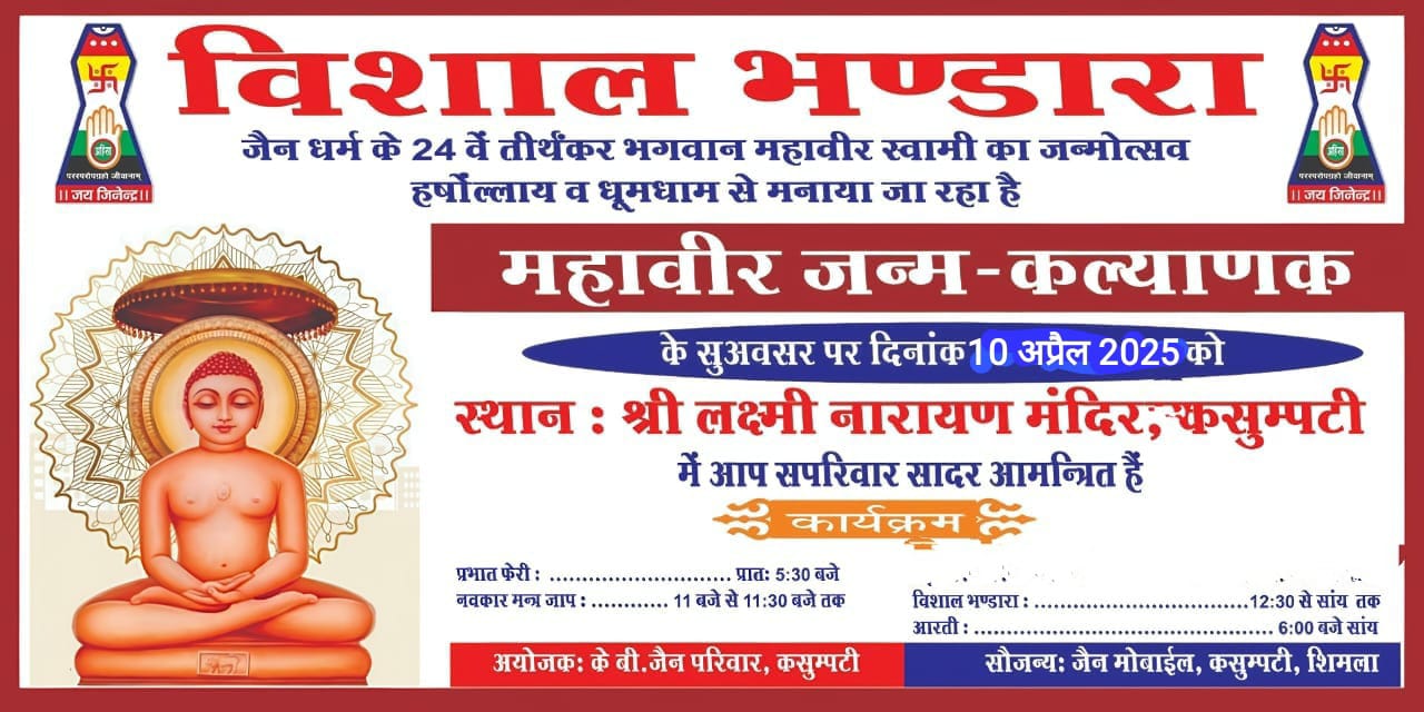 जैन धर्म के 24वें तीर्थंकर भगवान महावीर का जन्म कल्याणक महा महोत्सव 10 अप्रैल दिन वीरवार को श्री लक्ष्मी नारायण मंदिर,कसुम्पटी,शिमला में बड़ी श्रद्धा एवं हर्षोउल्लास पूर्वक मनाया जाएगा,समारोह के आयोजक कुल भूषण जैन ने बताया कि इस दिन प्रातः साढ़े पांच बजे मन्दिर से प्रभात फेरी निकाली जाएगी जिसके माध्यम से भगवान महावीर का अहिंसा व जिओ और जीने दो का संदेश जन मानस को दिया जाएगा,इसी दिन मन्दिर में 11 से 12 बजे तक जैन समाज द्वारा महामन्त्र नवकार का अखण्ड जाप किया जाएगा,इसके साथ ही दिन भर पूनम जैन मण्डली द्वारा भगवान महावीर के भजनों का गुणगान किया जाएगा,दोपहर साढ़े 12 बजे से सायं तक जैन मोबाइल,कसुम्पटी की ओर से विशाल भण्डारे का आयोजन किया जाएगा,जिसमे पारस जैन और चेतन जैन का विशेष योगदान रहेगा,भगवान महावीर की आरती शाम को 6 बजे होगी,उन्होंने सम्पूर्ण जैन समाज शिमला,मन्दिर के समस्त पदाधिकारियों तथा सभी लोगों से इस कार्यक्रम में बढ़चढ कर भाग लेने का अनुरोध किया है।