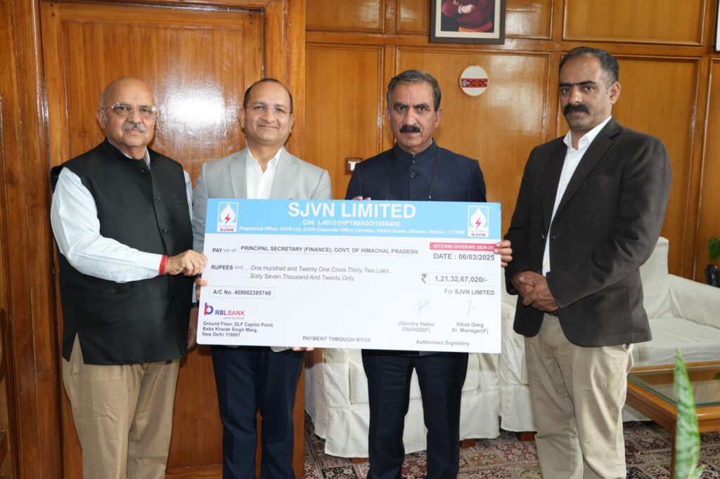 सतलुज जल विद्युत निगम लिमिटेड के निदेशक कार्मिक अजय कुमार शर्मा और कन्सलटेंट डा.एम.पी.सूद ने यहां मुख्यमंत्री ठाकुर सुखविन्द्र सिंह सुक्खू को वित्त वर्ष 2024-25 के लिए अंतरिम लाभांश के रूप में 1,21,32,67,020 (121.33 करोड़) रुपये का चैक भेंट किया।हिमाचल प्रदेश का सतलुज जल विद्युत निगम लिमिटेड में 26.85 प्रतिशत शेयर है।इस अवसर पर ग्रामीण विकास एवं पंचायती राज मंत्री अनिरुद्ध सिंह भी उपस्थित थे।