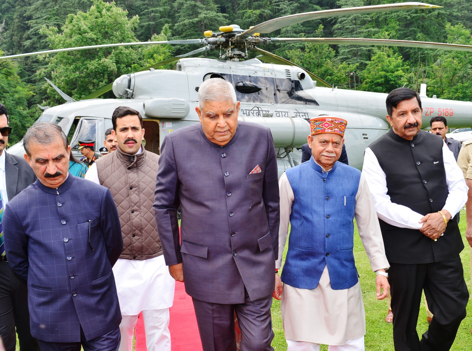 शिमला। भारत के उप-राष्ट्रपति जगदीप धनखड़ का शुक्रवार को शिमला के अन्नाडेल हेलीपेड पहुंचने पर राज्यपाल शिव प्रताप शुक्ल और मुख्यमंत्री ठाकुर सुखविंद्र सिंह सुक्खू ने गरिमापूर्ण अभिनन्दन किया।