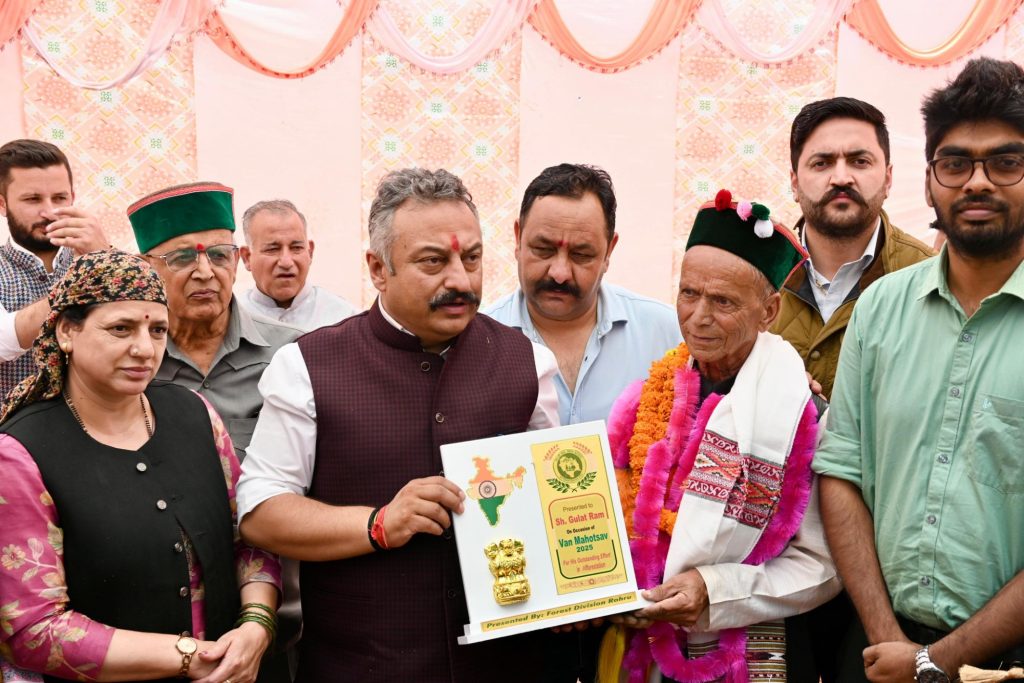 वन महोत्सव के अवसर पर टूटूपानी में शिक्षा मंत्री ने जकटेरली निवासी गुलट राम जोकटा को पर्यावरण के संरक्षण और संवर्धन में उनके योगदान के लिए विशेष रूप से सम्मानित किया और 20 हज़ार रूपये प्रोत्साहन राशि के रूप में देने की घोषणा भी की,गौरतलब है कि गुलट राम एक पर्यावरण प्रेमी व्यक्ति हैं और पिछले 25 वर्षों के दौरान उन्होंने 17000 वृक्ष लगाए है।शिक्षा मंत्री ने उनके प्रयासों की सराहना करते हुए कहा कि गुलट राम वर्तमान समय में प्रत्येक व्यक्ति के लिए एक मिसाल है और पर्यावरण संरक्षण की दिशा में हम सबको उनसे प्रेरणा लेनी चाहिए।इस अवसर पर वन्मण्डलाधिकारी रोहड़ू रविशंकर एवं वन विभाग के अन्य कर्मचारी भी उपस्थित रहे।