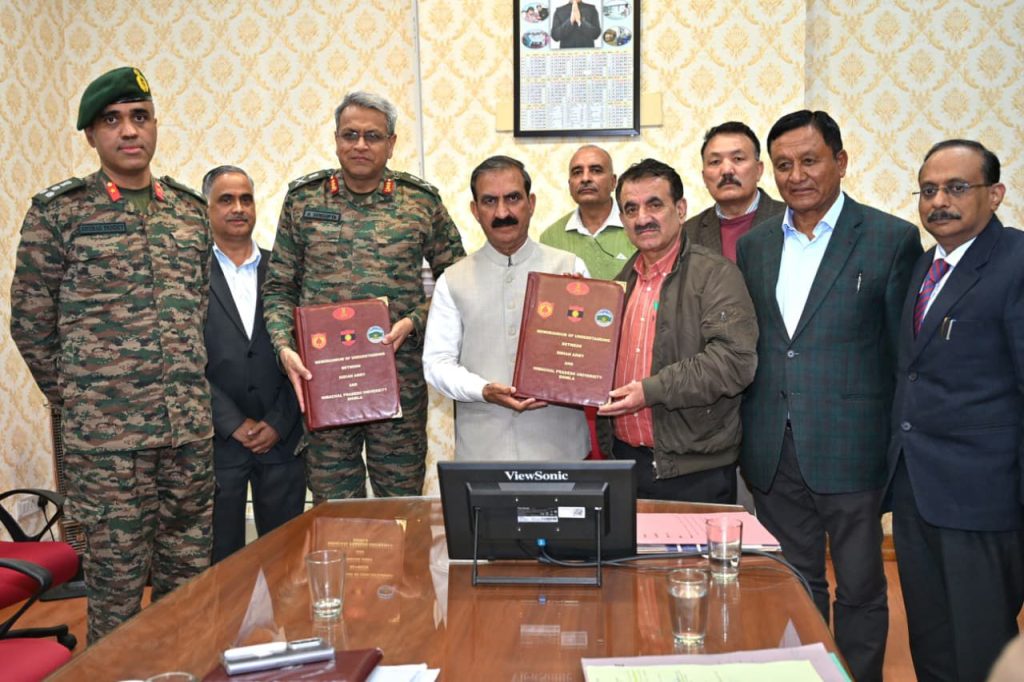 मुख्यमंत्री ठाकुर सुखविंद्र सिंह सुक्खू की उपस्थिति में हिमाचल प्रदेश विश्वविद्यालय,शिमला और भारतीय सेना के बीच सहयोगात्मक अनुसंधान एवं विकास पहलों को बढ़ावा देने के लिए एक समझौता ज्ञापन (एमओयू) पर हस्ताक्षर किए गए।ब्रिगेडियर अनुराग पांडे ने भारतीय सेना जबकि कुलपति प्रोफेसर महावीर सिंह ने प्रदेश विश्वविद्यालय की ओर से समझौता ज्ञापन पर हस्ताक्षर किए।मुख्यमंत्री ने कहा कि यह समझौता भारतीय सेना और प्रदेश विश्वविद्यालय के बीच एक सहक्रियात्मक साझेदारी की शुरुआत का प्रतीक है,जिसका उद्देश्य विविध क्षेत्रों में सहयोगात्मक अनुसंधान एवं विकास को बढ़ावा देना है।इसके मुख्य क्षेत्रों में भारत-तिब्बत संबंधों पर संयुक्त ऐतिहासिक शोध,निवेश और सतत विकास को प्रोत्साहित करने के लिए हिमाचल प्रदेश के सीमावर्ती क्षेत्रों पर आर्थिक और विकासात्मक अध्ययन,ड्रोन प्रौद्योगिकी और ड्रोन-रोधी उपायों की खोज और तैनाती,साइबर सुरक्षा की सर्वाेत्तम प्रथाओं का विकास और कार्यान्वयन तथा हरित ऊर्जा और पर्यावरण के प्रति जिम्मेदार प्रथाओं को बढ़ावा देने के लिए पहल शामिल हैं।यह प्रभावी सूचना प्रसार,अनुसंधान एवं शैक्षणिक सहयोग के लिए संकाय एवं कर्मचारियों के आदान-प्रदान तथा संयुक्त संगोष्ठियों,कार्यशालाओं एवं प्रशिक्षण कार्यक्रमों के आयोजन के लिए रणनीतिक एवं जनसंचार पहलों पर भी बल देता है। यह समझौता ज्ञापन भारतीय सेना के कर्मियों को हिमाचल प्रदेश विश्वविद्यालय,शिमला में शैक्षणिक पाठ्यक्रम करने का अवसर प्रदान करेगा।राजस्व मंत्री जगत सिंह नेगी,मुख्य सचिव संजय गुप्ता,लेफ्टिनेंट जनरल अनिंद्य सेनगुप्ता,लेफ्टिनेंट जनरल डीजी मिश्रा और सचिव,शिक्षा राकेश कंवर इस अवसर पर उपस्थित थे।