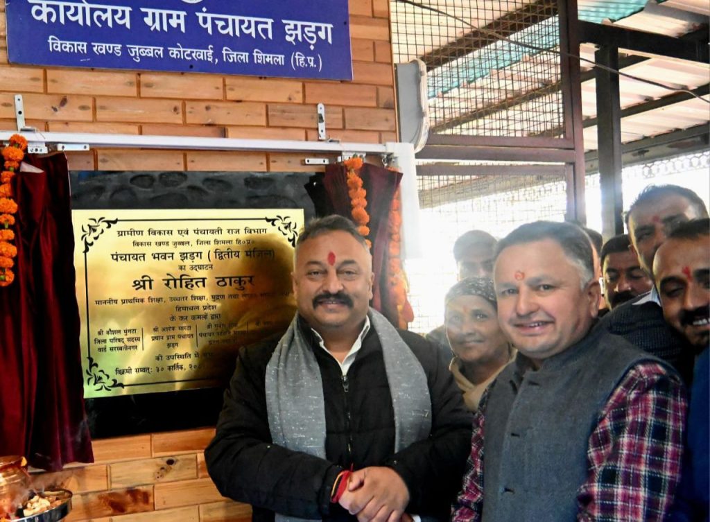 शिक्षा मंत्री रोहित ठाकुर ने उप मण्डल जुब्बल के अंतर्गत ग्राम पंचायत झड़ग में 35 लाख रूपये से निर्मित पंचायत भवन का  एवं 18 लाख की राशि से निर्मित सामुदायिक भवन का लोकार्पण किया।इस अवसर पर उन्होने ग्राम पंचायत झड़ग के निवासियों को बधाईया दी और बताया कि उनके विधानसभा क्षेत्र में जनता को अधिक से अधिक सुविधा प्रदान करने और आधारभूत संरचना को सुदृढ़ और मजबूत बनने के उद्देश्य से विभिन्न भवनों का निर्माण किया जा रहा है।इसी श्रृंखला में झड़ग में इन दोनों भवनों को जनता को समर्पित किया जा रहा है।उन्होंने यह भी बताया कि पंचायत भवन के निर्माण से जहां एक ओर पंचायती राज संस्थाओं के कार्यों में और अधिक दक्षता आएगी वहीं दूसरी ओर सामुदायिक भवन के निर्माण से ग्रामीणों को सामाजिक कार्यों के निर्वाहन में सुविधा होगी।इसके साथ ही रोहित ठाकुर ने झड़ग में 1 करोड़ 87 लाख की लागत से निर्माणधीन प्राथमिक स्वास्थ्य केंद्र के भवन के निर्माण कार्य का निरिक्षण भी किया।