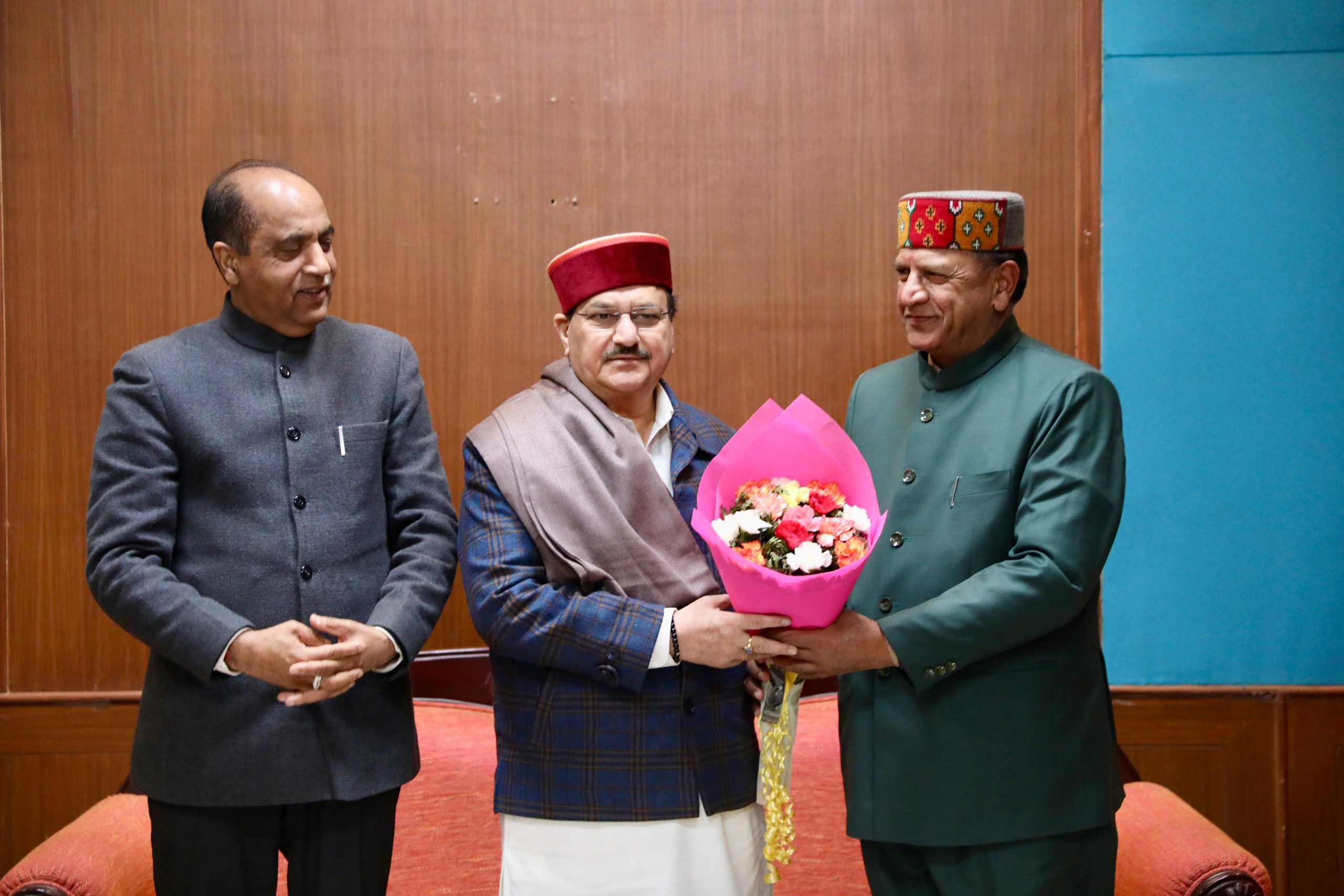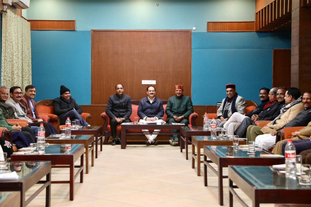 भाजपा के राष्ट्रीय अध्यक्ष एवं केंद्रीय मंत्री जगत प्रकाश नड्डा ने देर सायं शिमला के होटल पीटरहॉफ पहुंचने पर भाजपा विधायक दल की बैठक ली।बैठक में नेता प्रतिपक्ष जयराम ठाकुर,प्रदेशाध्यक्ष डा.राजीव बिंदल,प्रदेश प्रभारी श्रीकांत शर्मा,सह प्रभारी संजय टंडन और संगठम महामंत्री सिद्धार्थन विशेष रूप से मौजूद रहे।