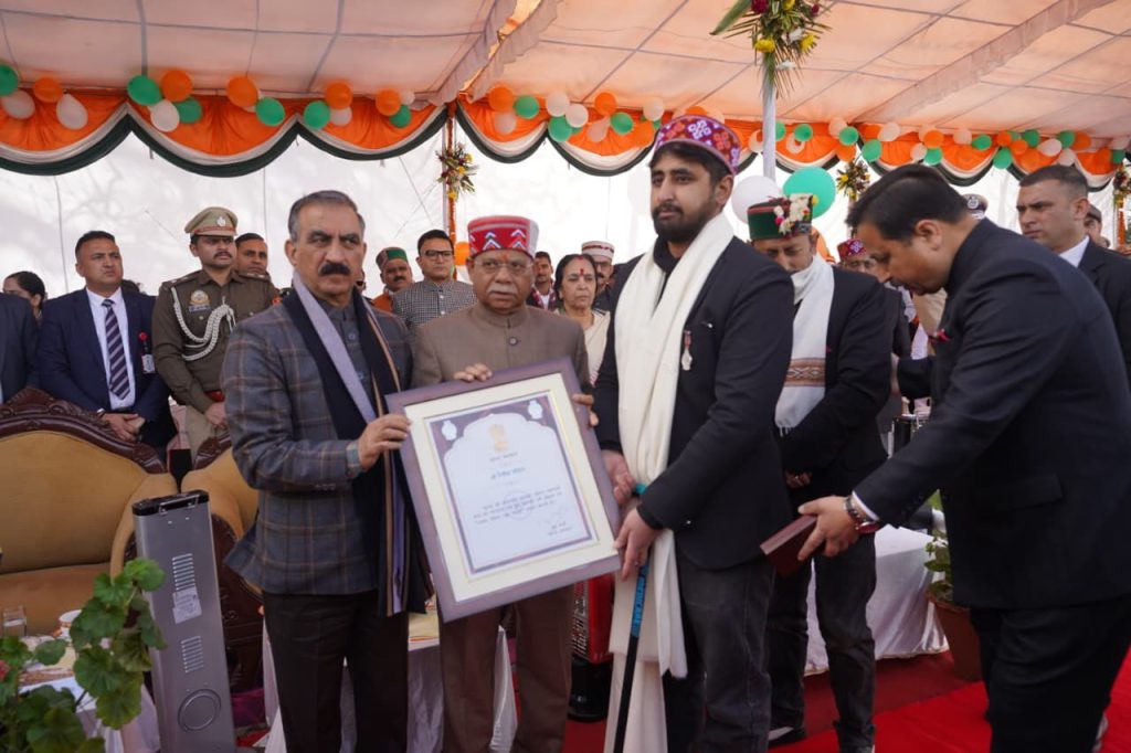 ऋतिक चौहान को किया सम्मानित:राज्यपाल और मुख्यमंत्री ने ऋतिक चौहान,निवासी गांव गागना,डाकघर चंबी,तहसील चौपाल,जिला शिमला को वर्ष 2024 के उत्तम जीवन रक्षा पदक से सम्मानित किया।ऋतिक ने रेलवे ट्रैक पर खेल रही दो बच्चियों को सामने से आ रही ट्रेन से बचाया और इस दौरान उनका पेअर पटरी में फस गया जिसके कारण उनकी एक टांग में फ्रैक्चर और दूसरी टांग में चोट लग गयी।