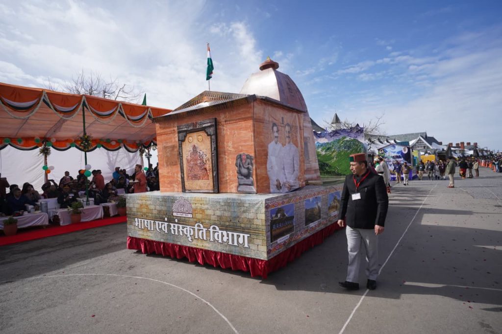 उद्योग विभाग द्वारा सीएम स्टार्टअप स्कीम,पशुपालन विभाग द्वारा बेसहारा पशु मुक्त समाज,जनभागीदारी से समाधान की ओर,भाषा एवं संस्कृति विभाग सूर्य नारायण मंदिर निरथ,स्वास्थ्य विभाग द्वारा तंबाकू मुक्त हिमाचल -स्वस्थ हिमाचल और परिवहन विभाग इलेक्ट्रिक व्हीकल की झांकियां प्रदर्शित की गई।