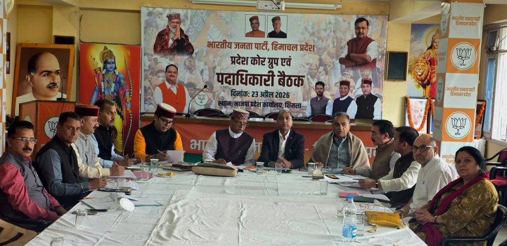 भाजपा प्रदेश मुख्यालय दीप कमल,चक्कर (शिमला) में भाजपा प्रदेश अध्यक्ष डॉ.राजीव बिंदल की अध्यक्षता में एक महत्वपूर्ण बैठक का आयोजन किया गया,जिसमें आगामी नगर निगम चुनावों को लेकर विस्तृत रणनीति पर चर्चा की गई।बैठक में नेता प्रतिपक्ष एवं पूर्व मुख्यमंत्री जयराम ठाकुर,प्रदेश प्रभारी श्रीकांत शर्मा,सह प्रभारी संजय टंडन, प्रदेश उपाध्यक्ष विपिन परमार,बिहारी लाल शर्मा,रश्मि धर सूद,राजेश ठाकुर,पवन काजल,बलबीर वर्मा,प्रदेश महामंत्री संजीव कटवाल,पायल वैद्य,प्रदेश सचिव वंदना योगी,वरिष्ठ प्रवक्ता त्रिलोक जमवाल,त्रिलोक कपूर,सुधीर शर्मा,संजीव शर्मा सहित अनेक वरिष्ठ नेता उपस्थित रहे।इसके अतिरिक्त विधायक अनिल शर्मा,इंद्र सिंह गांधी,जिला अध्यक्ष रतन सिंह पाल,सचिन शर्मा,रागिनी रकवाल,निहाल चंद शर्मा,राजेश कश्यप,शैलेंद्र गुप्ता भी बैठक में मौजूद रहे।बैठक में मंडी,सोलन,पालमपुर और धर्मशाला,चारों नगर निगमों के चुनावों को लेकर विस्तृत चर्चा की गई और प्रत्येक क्षेत्र के लिए अलग-अलग रणनीति तैयार की गई।